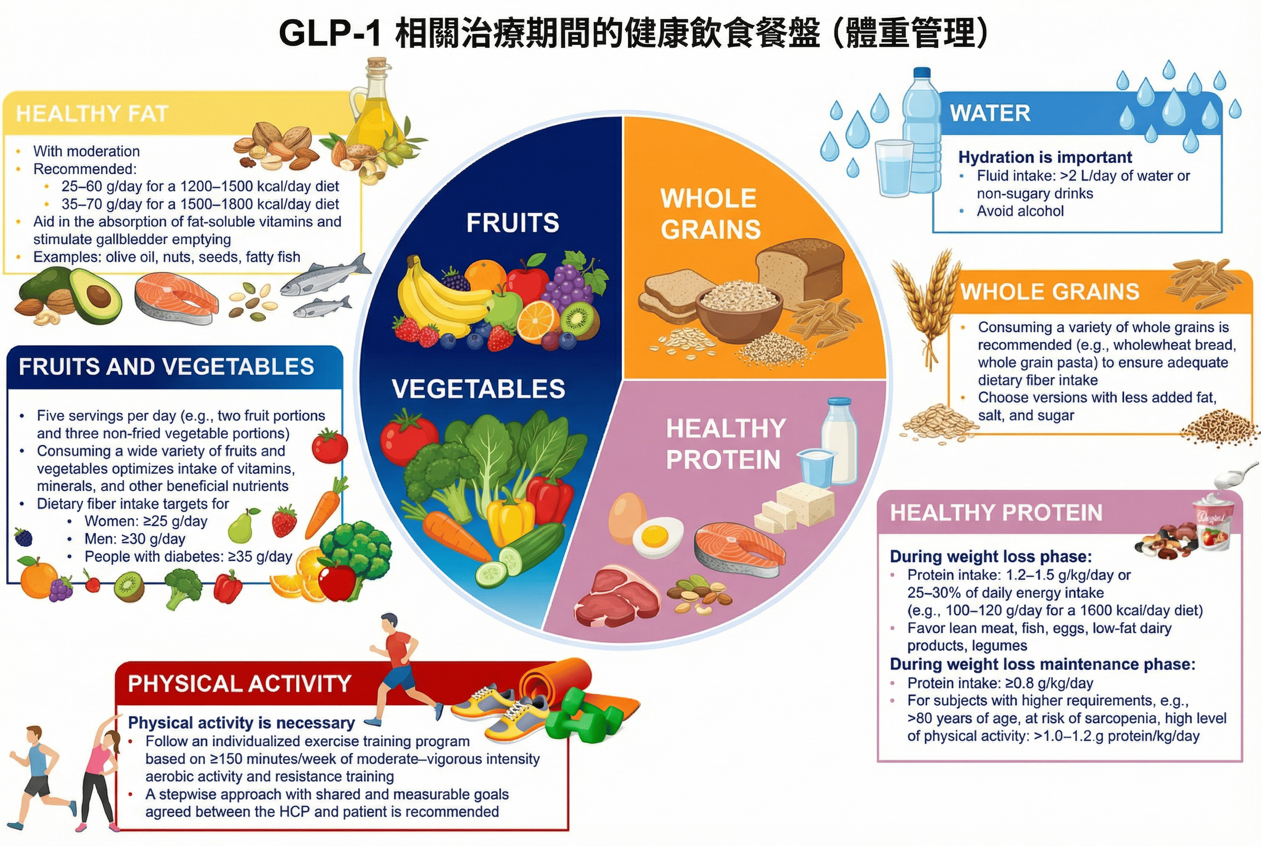 GLP-1類藥物如Saxenda、Wegovy和Mounjaro已改變肥胖治療格局,能使體重減少5%至18%,並帶來心血管益處,但常伴隨胃腸道不適、肌肉流失和營養缺乏風險。 由於藥物抑制食慾並延緩胃排空,患者易忽略均衡飲食,導致蛋白質不足或纖維攝取過低,從而加劇疲勞或便秘。 因此,專家建議以圖示化的健康飲食盤為指南,確保每日熱量控制在1200-1800大卡,同時優先高品質營養。